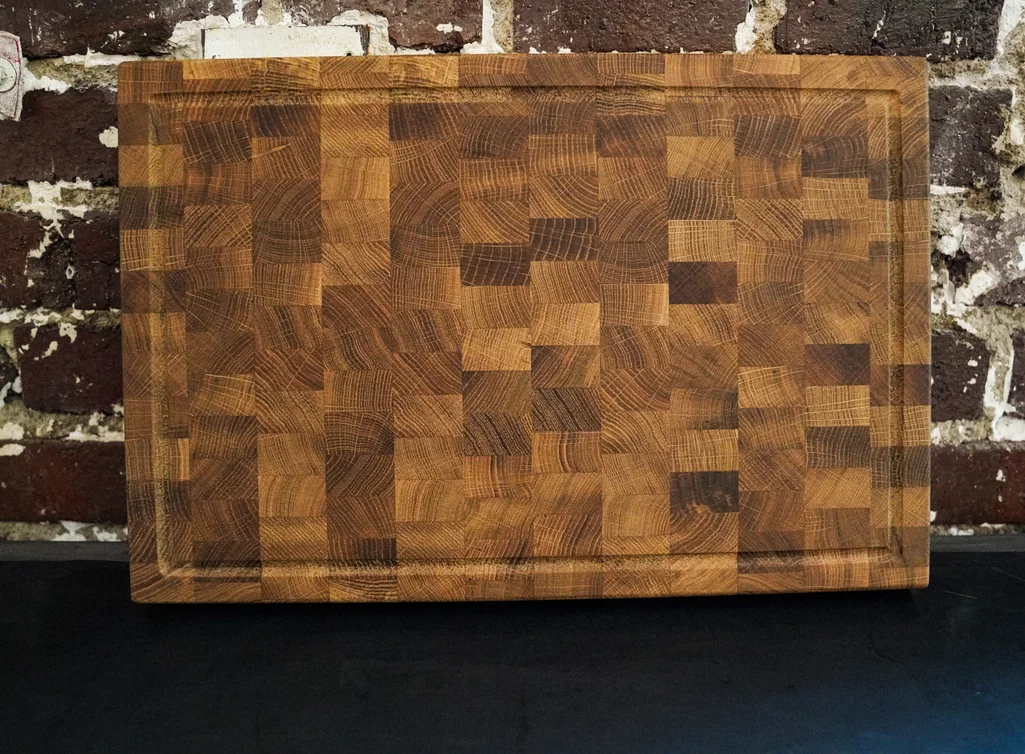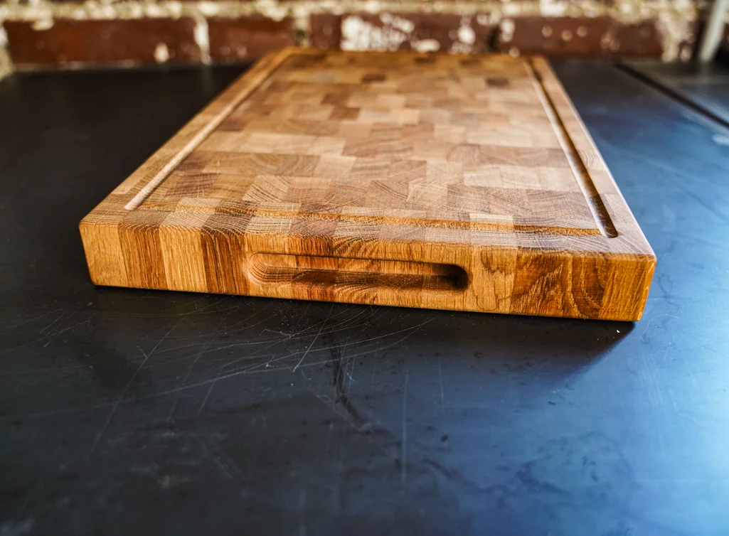 Hochwertiges Hirnholz-Schneidebrett aus massiver Eiche (40 x 30 x 4 cm), langlebig, messerschonend und mit natürlicher antibakterieller Wirkung – ideal für den täglichen Einsatz in der Küche.